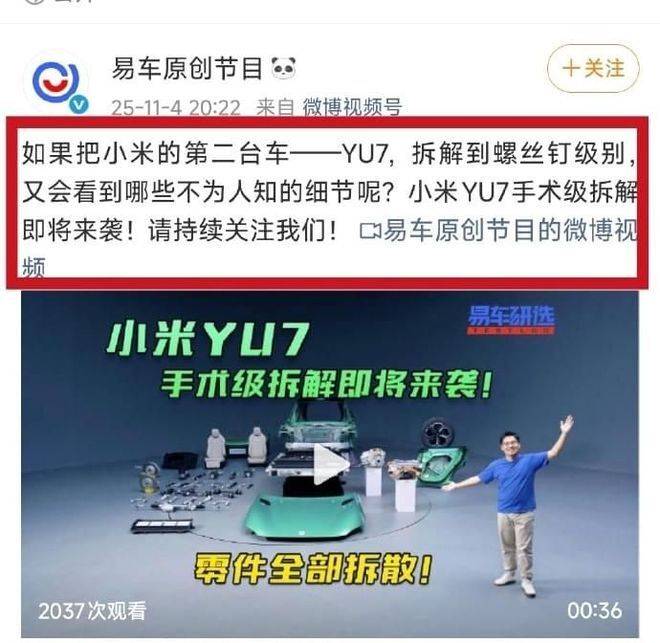 11 月 5 日,汽车圈与科技圈同时被一则消息引爆 —— 易车原创节目发布 “小米 YU7 全网首拆” 视频,对这台小米首款量产车从里到外、从上到下进行了 “底裤级” 拆解。对此,小米集团创始人雷军亲自在微博回应:“我认真看完这个拆解视频,推荐 YU7 车主们都看看。也欢迎各位同行和专家指点。”